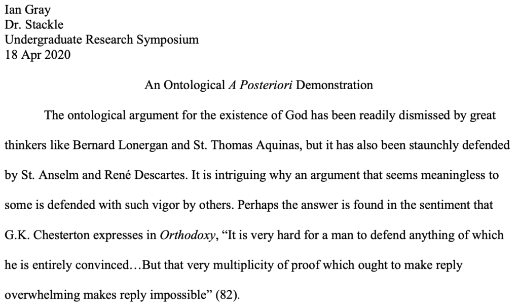 I presented a philosophy paper that I wrote last semester entitled, "An Ontological A Posterior Demonstration." I have attached a copy of it below, but it is filled with some technical terminology which might make it difficult to read. The paper centers around an argument that when one hears someone say, "that than which nothing greater can be thought," he understands and knows that God exists. I explore whether or not this is the case.